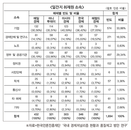 이들 경제매체의 기사에 등장하는 취재원 중에는 시민단체, 노조, 소비자 등 경제 이해관계자 집단의 관점을 보여주는 취재원은 극히 적었다. 매일경제, 머니투데이, 아시아경제, 한국경제, 헤럴드경제 (가나다 순) 등 5개 경제일간지를 미국발 경제위기 시기(2008년 9월~2009년 2월)와 경제 안정기(2012년12월~2013년 5월)로 나눠 총 1년 간 분석한 결과 기업이 33.9%로 비율이 가장 많았고 정부 및 공공기관이 29.34%, 경제단체 및 연구소 16%, 정치권 9%, 타매체 3.6%, 학계 3.4% 순이었다. 노조(0.8%)와 시민단체(0.4%)가 취재원으로 등장하는 경우는 극히 적었다.