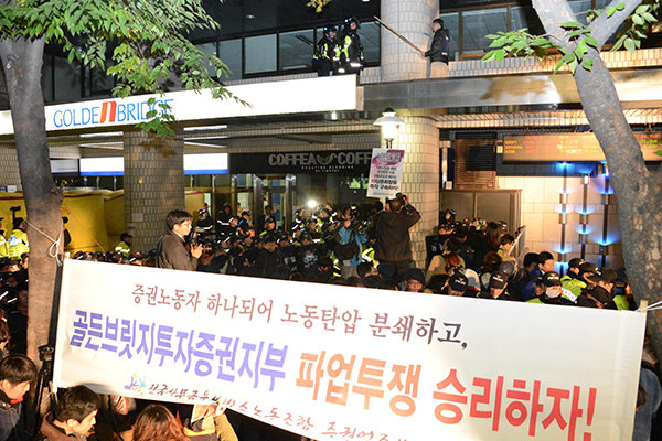 ▲ 국내 경제매체들의 비즈니스 모델이 광고수입에 전적으로 의존하다보니 노조나 시민단체의 목소리는 극히 반영되지 않는다는 보고서가 나왔다. 사진은 골든브릿지투자증권 김호열 노조위원장이 지난 28일 오후 서울 서대문구 충정로 골든브릿지 본사 2층 난간에서 천막을 치고 농성을 하던 중 경찰과 대치하고 있는 모습. (뉴시스) |