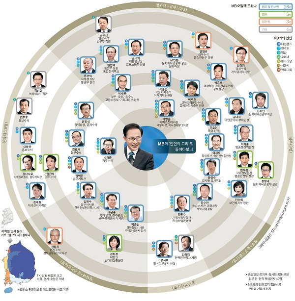 또 하나의 문제는 취재대상에 해당하는 이들을 어떤 기준에 의해서 분류하는가였다. 취재팀은 ‘인연의 고리’라는 표현을 붙였다. 고려대, 영남, 서울시, 인수위, 대선캠프, 한나라당이 바로 그 고리에 해당했다. 인연의 고리는 대통령이 직접 임명하거나 임명에 관여한 인사의 인선 배경을 들여다 볼 수 있는 단서에 해당한다. 대통령을 중심으로 해 그 최측근 그룹과 해당 인사 대상자가 어떤 인연의 끈을 갖고 있는지를 보면 인사의 기준이나 원칙을 분석할 수 있다는 판단에서다.