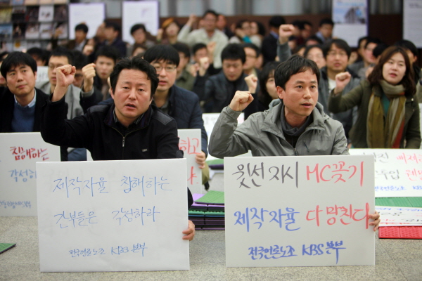 나원식 KBS PD협회 부회장도 “이 사태를 보고만 있으면 우리가 좀비나 로봇밖에 될 수 없는 상황이 된 것 같다”며 “끝까지 투쟁할 것”이라고 밝혔다. 그는 “코비스(사내게시판)에 보면 ‘직종 이기주의다’, ‘너희들 하고 싶은 대로 하는 게 제작 자율성이냐’ 하는 어처구니 없는 주장을 하는 분들이 있다”며 “제작 자율성이란 게 뭐냐. 사내 유무형의 외압에 굴하지 말고 불편부당하게 모든 국민들에게 양식이 될 수 있는 프로그램을 만드는 게 제작 자율성의 의미 아니냐”고 되물었다.