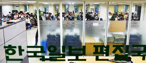 ▲ 지난 6월 사측에 의해 폐쇄됐던 한국일보 편집국 문이 25일 만인 7월9일 열린 가운데 기자들이 한국일보 편집국에서 회의를 하고 있다. 9월 법원의 기업회생절차 개시 결정으로 한국일보는 법정관리를 받고 있다. (뉴시스) |