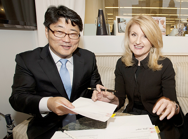 ▲ 한겨레 양상우 대표이사가 지난 8일(한국시각) 뉴욕 맨해튼에 있는 허핑턴포스트 본사를 방문해 아리아나 허핑턴 회장과 허핑턴포스트코리아 공동설립을 위한 기본의향서(LOI)를 맺었다. (사진=한겨레 제공) |