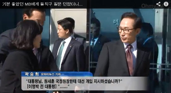 곽승희 오마이뉴스 기자는 지난 13일 경북 포항 덕실마을 덕실관(대통령기념관) 2층에서 영상을 관람한 후 내려온 이 전 대통령에게 “원세훈 국정원장에게 대선 개입 지시를 했는가”라고 질문을 던졌다. 주변 경호원들은 곽 기자를 밀치며 제지했다. 이 전 대통령은 앞서 걸어가며 곽 기자를 뒤돌아 쳐다볼 뿐 묵묵부답이었다.
