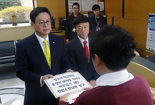 | ▲ 14일 서울 종로구 재동 헌법재판소에서 새누리당 정우택 최고위원이 충청권 국회의원 수의 위헌여부를 판단해 달라는 헌법소원 심판을 청구하고 있다. (사진=정우택 국회의원실) | ||