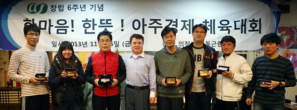 | ▲ 곽영길 아주경제신문 대표(왼쪽에서 네번째)가 15일 창립 6주년 '한마음 한뜻 아주경제 체육대회'에서 5년 근속자들에게 황금열쇠를 수여한 후 기념촬영을 하고 있다. (사진=아주경제) | ||