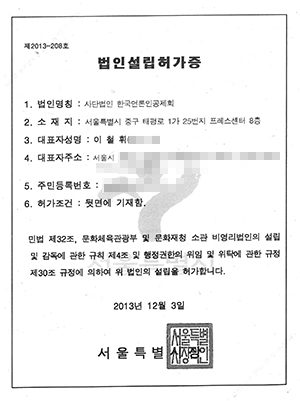 서울시는 3일 민법 제32조, 문화체육관광부 및 문화재청 소관 비영리법인의 설립 및 감독에 관한 규칙 제4조 및 행정권한의 위임 및 위탁에 관한 규정 제30조 규정에 의해 한국언론인공제회의 설립을 허가한다고 밝혔다.