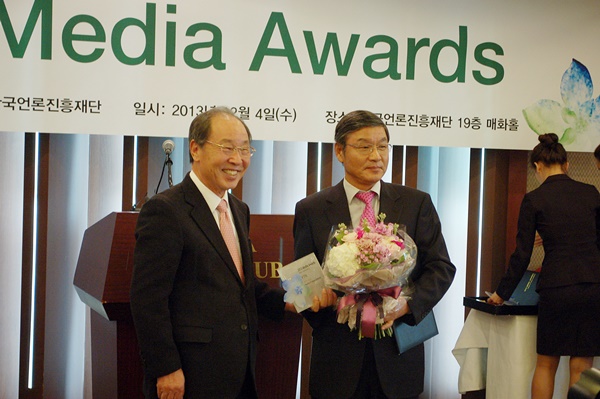 | ▲ 4일 미디어미래연구소 주최로 열린 '제7회 미디어 어워드' 시상식에서 신뢰성·공정성 1위를 차지한 YTN 배석규 사장(오른쪽)이 수상 후 기념촬영을 하고 있다. | ||