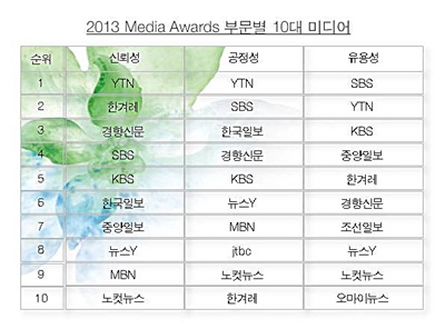 신뢰도 부문에서 YTN은 2007년 이후 처음으로 1위에 올랐다. 2위를 차지한 한겨레는 3.3211점으로 신문사 중 가장 높은 점수를 기록했다. 2011년과 2012년 연속 1위였던 경향신문은 3.2740점으로 3위로 내려갔다. SBS(3.2083), KBS(3.2049), 한국일보(3.0611), 중앙일보(3.0053) 등이 그 뒤를 이었다. 종합편성채널 중에서는 9위를 차지한 MBN이 신뢰도 순위 10위 안에 유일하게 들었다.