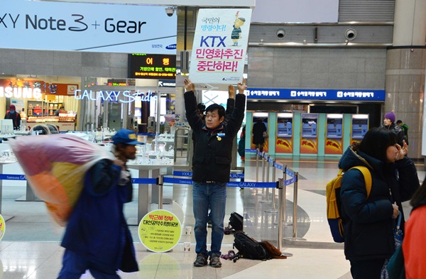 ▲ 전국철도노조가 파업에 돌입한 9일 오전 서울 용산구 용산역에서 철도노조 조합원이 KTX 민영화 추진 중단을 촉구하는 피켓을 들고 있다. (뉴시스)