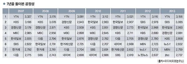 공정성 부문 성적표는 더욱 초라하다. 2007~2008년 공정성 2위였던 KBS는 이듬해부터 3위로 내려앉더니 올해는 5위까지 하락했다. 2년 연속 2위를 차지한 SBS와 대조적인 결과다.