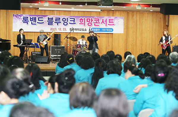 지난 23일에는 국내 유일의 여자교도소 청주여자교도소에서도 공연을 진행했다. 재소자들 반응은 시작부터 폭발적이었다. 이들은 블루잉크가 노래할 땐 두 팔을 높이 들어 물결을 만들거나, 빠른 박자에 맞춰 박수를 쳤다.