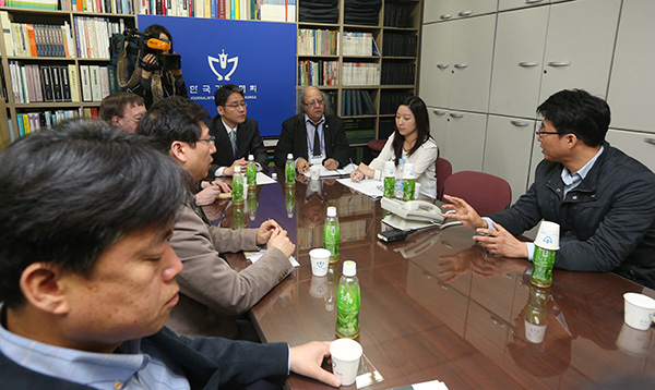 ▲ 지난해 4월 16일 세계기자대회(World Journalist Conference) 참석차 한국을 찾은 짐 보멜라 국제기자연맹(IFJ) 회장이 서울시 중구 한국기자협회 회의실에서 해직언론인과의 간담회를 하고 있다. (연합뉴스) |