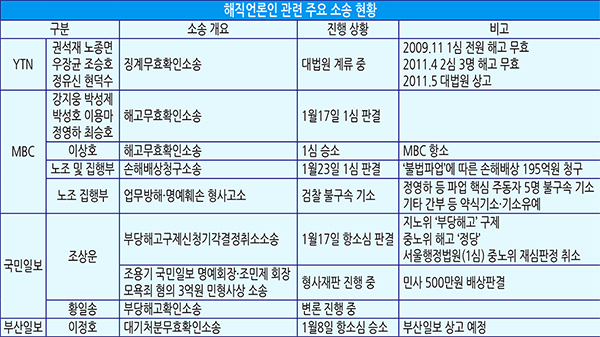 이정호 전 부산일보 편집국장도 1심에 이어 지난 8일 2심에서도 해고 무효 판결을 받았지만 사측은 상고할 방침이다. 조상운 국민일보 해직기자도 해고가 정당하다는 중앙노동위원회의 재심 판정이 잘못이라는 1심 판결에 이어 오는 17일 2심 판결을 기다리고 있다. 2심 판결이 어떻게 나오든 대법원까지 가서 다툴 가능성이 크다.