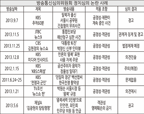 실제 방심위는 ‘종북’ 논란 등 정치적 사안과 관련해 일관성 없는 심의 규정 적용을 되풀이해왔다. 가장 최근 논란이 된 것이 JTBC에 대한 중징계다. 방심위는 지난해 12월 JTBC ‘뉴스9’가 통합진보당 해산심판 청구 건을 다루면서 당사자인 김재연 의원 등을 출연시켰다는 이유로 공정성과 객관성 위반을 문제 삼아 ‘해당 방송프로그램의 관계자에 대한 징계 및 경고’를 의결했다. 앞서 지난해 11월에는 탈북자 출신 서울시 공무원 간첩 사건의 전말을 다룬 KBS ‘추적60분’에 대해 역시 중징계인 ‘경고’를 내렸다. 해당 방송은 1심에서 무죄로 판명난 국가정보원의 무리한 간첩 기소를 다뤘지만, 여당 추천 위원들은 아예 ‘간첩’으로 규정하며 제작진이 재판 결과에 영향을 주려는 의도가 있었다는 등의 이유를 댔다.
