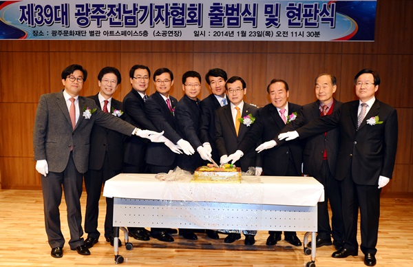 | ▲ 23일 오전 광주 남구 광주문화재단 별관 아트스페이스 5층에서 열린 제39대 광주전남기자협회 출범식에서 참석자들이 축하 떡케익을 자르고 있다. (사진=광주전남기자협회) | ||