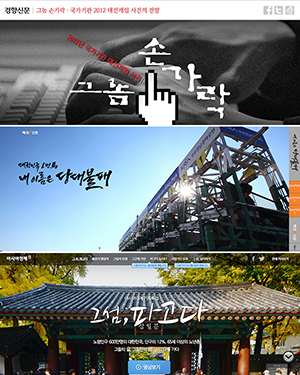 ▲ 사진과 동영상, 인포그래픽 등을 유기적으로 구성한 멀티미디어뉴스가 각광을 받고 있다. 위로부터 경향신문 ‘그놈 손가락’, 매일경제 ‘내이름은 당대불패’, 아시아경제의 ‘그섬, 파고다’를 캡처한 장면. |