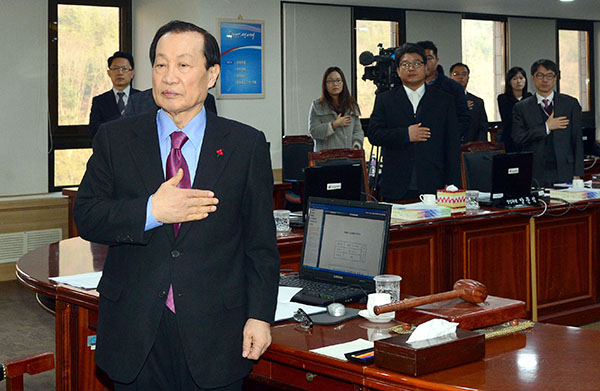 ▲ 지난달 27일 열린 방송통신위원회 전체회의에서 이경재 위원장을 비롯한 참석자들이 국민의례를 하고 있다.(뉴시스) |