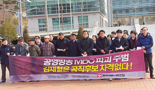▲ 전국언론노동조합과 진주 사천지역 시민사회단체는 28일 사천시청에서 열린 김재철 전 MBC 사장의 사천시장 출마 기자회견에 맞춰 규탄 기자회견을 갖고 지역언론을 말살한 김 전 사장의 출마를 규탄하고 강력히 반대투쟁을 해 나가겠다고 밝혔다. (뉴시스) |