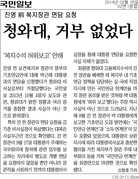 그러나 국민일보는 5일자 2면 ‘청와대, 거부 없었다’ 제하의 기사에서 “국민일보 2013년 10월 4일자 보도와 관련, 청와대가 밝힌 정황과 여러 증거를 종합한 결과 사실이 아닌 것으로 밝혀졌다”고 보도했다.