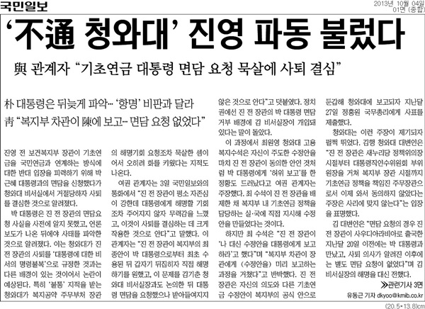 지난해 10월4일 국민일보는 1면 단독 기사에서 진 전 장관이 사퇴 직전 공약 후퇴 논란을 빚은 기초연금 사안을 논의하기 위해 박근혜 대통령에게 면담을 요청했으나 김기춘 대통령 비서실장이 이를 묵살했고, 이것이 사퇴의 결정적 계기가 됐다고 보도했다. 또 최원영 청와대 고용복지수석이 진 전 장관을 배제한 채 국민연금 연계안을 만들고 마치 장관이 동의한 것처럼 대통령에게 허위 보고를 했다고도 전했다.