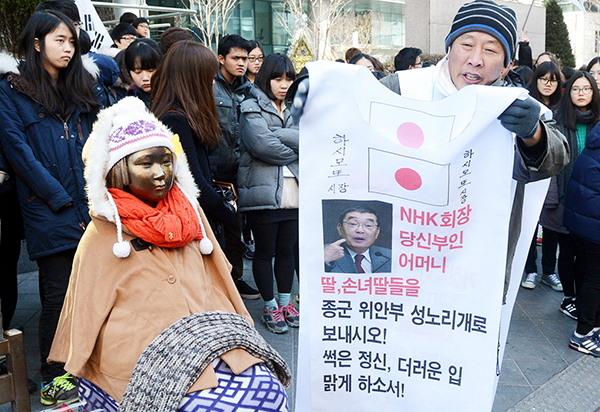 ▲ 지난달 29일 서울 종로구 일본대사관 앞에서 정기수요집회가 열리기 전 한 시민이 위안부 망언을 한 하시모토 NHK 회장을 규탄하고 있다.(뉴시스) |