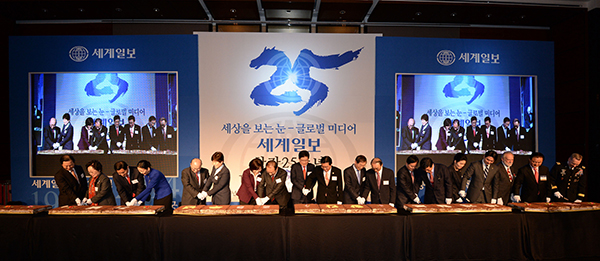 ▲ 세계일보가 지난 11일 오후 6시 서울시 여의도동 콘래드 서울 3층 그랜드 볼룸에서 창간25주년 기념 축하연을 개최했다. 이날 기념식에서 조한규 세계일보 사장을 비롯한 각계 인사들이 축하떡을 자르고 있다. (사진=세계일보)