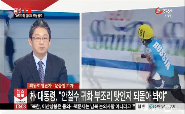TV조선은 13일 오후 뉴스특보에서 박 대통령이 2014 소치 동계올림픽 쇼트트랙 1500m 동메달리스트인 안현수 선수 귀화 문제를 지적한 발언에 대한 자막에서 “안철수 귀화 부조리 탓인지 되돌아 봐야”라고 처리했다.
