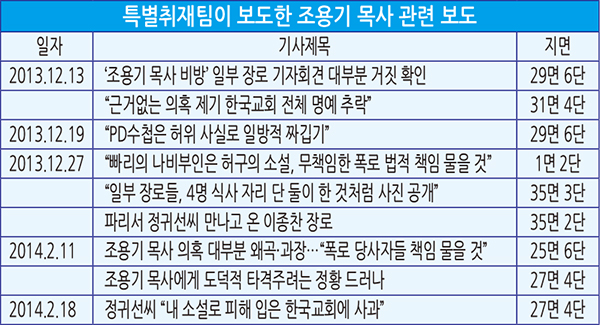 입장이 첨예하게 갈리는 사안임에도 불구하고 대부분 조 목사 측의 주장을 부각하거나 두둔하는 기사들이다. 또한 사설·칼럼을 제외한 14건의 기사 중 9건이 취재기자가 누구인지 모르는 ‘특별취재팀’이라는 익명의 바이라인을 사용했다. 특별취재팀은 3~4명의 종교국 기자들로 구성된 것으로 알려졌으나 내부 구성원들은 이에 대해 입을 다물고 있다.