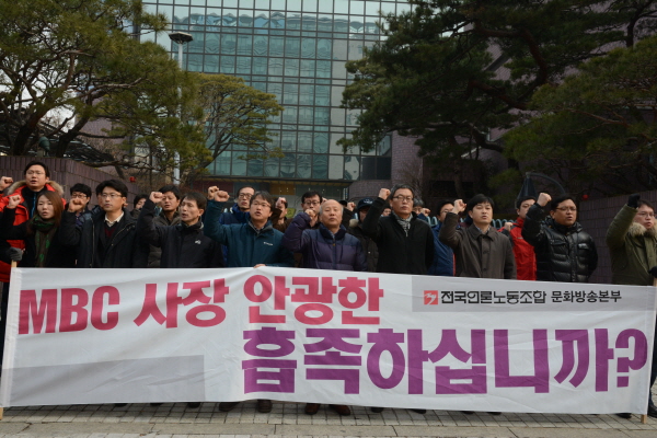 권오훈 언론노조 KBS 본부장은 “4년 전, 김연아 선수가 벤쿠버올림픽에서 금메달을 따던 날 김재철 사장이 선출됐고, 그날 KBS 조합원들이 MBC 앞에서 촛불을 들고 MBC 지키기를 했지만 4년 동안 상황은 더욱 악화가 됐다”며 “김재철 키즈인 안광한 사장이 MBC 해고언론인 7명을 복직시켜 결자해지해야 한다”고 주장했다.