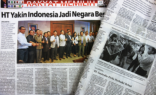 한국 기자단은 인도네시아 최대 미디어그룹인 MNC를 이끌고 있는 ‘인도네시아의 미디어 제왕’으로 불리는 하리 타누수디뵤 회장, 티파툴 슴비링 정보통신부 장관, 서부자바주의 아마드 헤르야완 주지사 등을 만나 양국 기자협회의 교류가 갖는 의미를 자세히 설명했다.