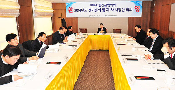 ▲ 전국지방신문협의회(회장 김중석 강원도민일보 사장) 2014년 정기총회 및 1차 사장단 회의가 지난 21일 서울 중구 프레스센터에서 열렸다. (사진=강원도민일보) |