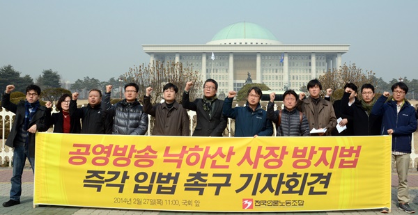 전국언론노조는 27일 국회 앞에서 기자회견을 열고 공영방송의 낙하산 사장 선임 방지를 위한 특별다수제 등 대책을 마련한 입법을 촉구했다. 전국언론노조는 “방송의 정치적 독립과 공정성 보장의 핵심인 ‘공영방송 지배구조 개선’은 이번 국회 처리 안건에서 제외됐다”며 “2월 임시국회의 회기를 연기해서라도 공영방송 낙하산 사장 방지 법안을 반드시 처리해야한다”고 밝혔다.