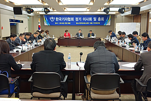 | ▲ 28일 서울 중구 한국프레스센터 19층 기자회견장에서 열린 '2014 정기 이사회 및 총회'에서 박종률 한국기자협회장이 발언하고 있다. | ||