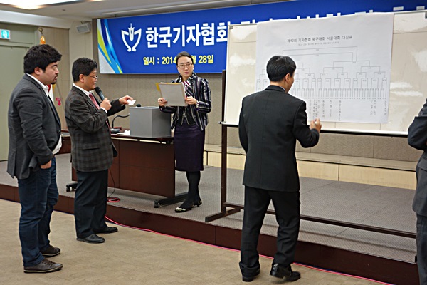 | ▲ 28일 서울 중구 한국프레스센터 19층 기자회견장에서 열린 '2014 정기 이사회 및 총회'가 끝난 후 기자협회 축구대회 대진 추첨이 진행되고 있다. | ||