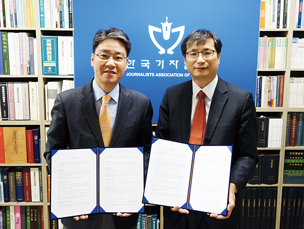 ▲ 박종률 한국기자협회장(왼쪽)과 김준현 민변 언론위원장이 4일 서울 중구 한국프레스센터 13층 기자협회 회의실에서 양해각서에 서명한 뒤 기념촬영을 하고 있다. |