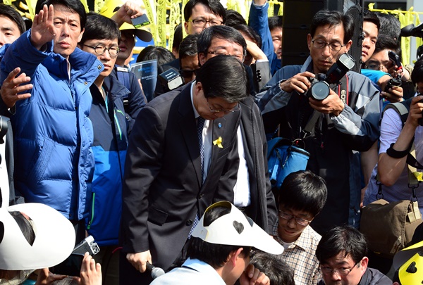 | ▲ 길환영 KBS사장이 9일 오후 서울 종로구 청운동 주민센터에서 대통령과의 면담을 요구하며 농성을 벌이고 있는 세월호 희생자 유가족들에게 김시곤 KBS보도국장의 발언과 관련해 고개숙여 사과하고 있다. (뉴시스) | ||
