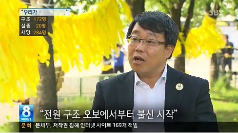 | ▲ 15일 SBS는 8시 뉴스에서 김성준 앵커가 전날 안산 정부 합동 분향소에서 만난 유족과의 대담을 보도했다. 유경근 세월호 사고 가족 대책위원회 대변인이 언론에 대한 불신을 말하고 있다. (사진=SBS 캡쳐) | ||