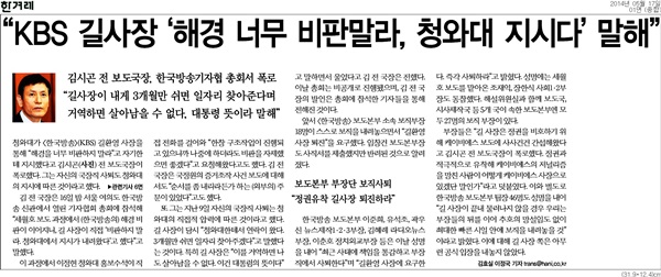 한편 한겨레는 길환영 KBS 사장이 KBS 인사와 보도에 직접적으로 개입했다는 김시곤 전 보도국장의 폭로를 1면을 통해 전달했다.