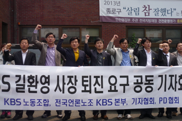 ▲ KBS노동조합(1노조), 전국언론노조 KBS본부(새노조)와 KBS 기자·PD·경영·기술인·촬영감독협회 등 5개 직능단체가 23일 청운효자동 주민센터 앞에서 기자회견을 열고 길환영 사장 퇴진과 박근혜 대통령 사과를 촉구했다. |