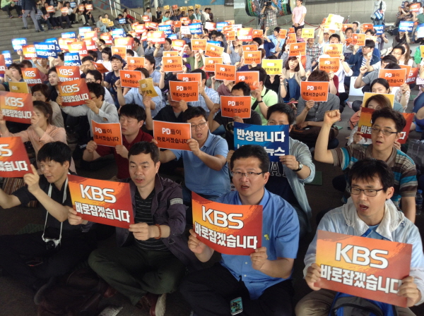 ▲ 23일 닷새째 제작거부 중인 KBS 기자협회와 이날 하루 제작거부에 참여한 KBS PD협회가 공동 총회를 열어 길환영 사장 퇴진을 촉구했다. |