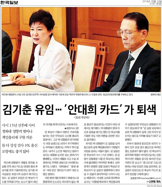 24일 일부 조간신문은 1면을 통해 박근혜 정부 2년차의 국정 쇄신을 전망하는 기사를 실었다. 국민일보는 “박근혜 대통령이 6·4지방선거 이후 사실상 조각 수준의 전면 교체를 단행한다”며 “안전행정부 해양수산부 교육부 등은 물론 지난해부터 위기대응 과정에서 많은 문제점을 노출했던 ‘현오석 경제팀’도 사실상 대폭 물갈이 대상이 될 것이라는 게 청와대와 여권의 기류”라고 전했다.