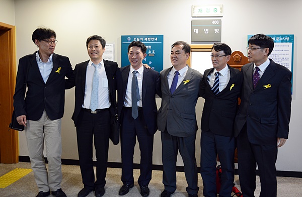 | ▲ 2012년 MBC파업을 이끌어 업무방해 혐의로 기소된 전국언론노조 MBC본부 전 집행부에 대해 국민참여재판에서 '무죄'가 판결됐다. 27일 판결 직후 (왼쪽)정영하 전 위원장과 이용마 전 홍보국장, 신인수 변호사, 강지웅 전 사무처장, 김민식 전 편성제작부위원장, 장재훈 전 정책교섭국장이 함께 웃고 있다. | ||