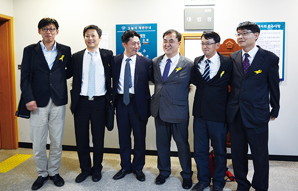 27일 새벽 4시30분. 17시간의 재판을 끝내고 서울남부지법 406호 법정 앞에 선 5명의 언론인들은 환하게 웃었다. 재판부가 무죄라고 선고한 순간, 그들에게는 170일간의 싸움이 주마등처럼 스쳐 갔다. 변호를 맡은 신인수 변호사의 말처럼 ‘사필귀정(事必歸正)’이었다. 서울남부지법 제23형사부(재판장 박정수)는 2012년 공정방송을 외치며 170일간 전국언론노조 MBC본부 파업을 이끈 정영하 전 위원장 등 전 노조 집행부 5명에 대한 업무방해 혐의에 무죄를 선고했다. 국민참여재판으로 7명의 배심원 평결을 받아들인 결과다. 늦은 밤 함께한 30여명의 MBC 동료들 사이에서 박수가 터져 나왔다. 지난 1월 2건의 민사소송에 이어 또다시 파업의 정당성을 입증한 순간이었다.