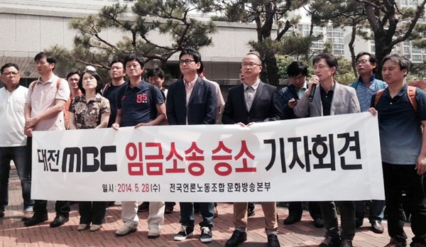 | ▲ 전국언론노조 MBC본부가 28일 대전지방법원 앞에서 대전MBC 임금소송 승소 기자회견을 개최했다. (사진=전국언론노조) | ||
