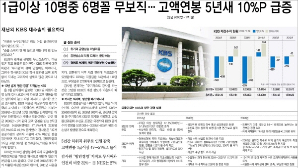 동아일보는 지난 28일부터 사흘 연속 ‘재난의 KBS 대수술이 필요하다’는 제목의 기획기사를 내보냈다. △위기의 공영방송 저널리즘 △공영방송의 막장 드라마, 끝장 예능 △경영도 낙제점, 방만 경영부터 수술하라 등의 주제로 매일 각각 두 꼭지씩, 전면을 채웠다.