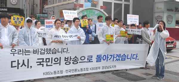 | ▲ KBS 양대노조가 총파업에 돌입한 지 5일째로 접어든 2일, 경남 창원시 의창구 용호동 정우상가 인도에서 KBS 노동조합 경남도지부와 전국언론노조 KBS본부 경남도지부 소속 조합원 40여 명이 길환영 사장의 퇴진을 촉구하는 집회를 열었다.(뉴시스) | ||