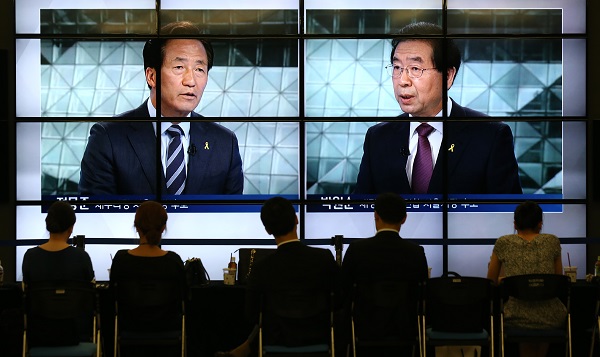 | ▲ 2일 밤 서울 중구 순화동 JTBC방송사 로비에서 취재진이 대형 화면으로 생중계되고 있는 정몽준 새누리당 서울시장 후보(왼쪽)와 박원순 새정치민주연합 서울시장 후보의 토론회를 지켜보고 있다.(뉴스1) | ||