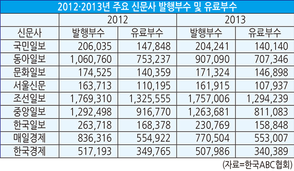 한국ABC협회가 3일 공개한 ‘2013년도 일간신문 인증 결과’에 따르면 문화일보, 머니투데이, 헤럴드경제 등을 제외한 국민일보, 동아일보, 서울신문, 조선일보, 중앙일보, 한국일보, 매일경제, 한국경제 등 주요 신문사의 지난해 유료부수는 전년 대비 1~12% 감소했다.