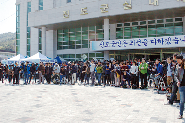 ▲ 세월호 침몰 사고가 난 나흘 뒤인 지난 4월20일 당시 정홍원 국무총리 방문 소식에 진도 실내체육관 앞에 기자들이 모여 있다. (김희영 기자) |