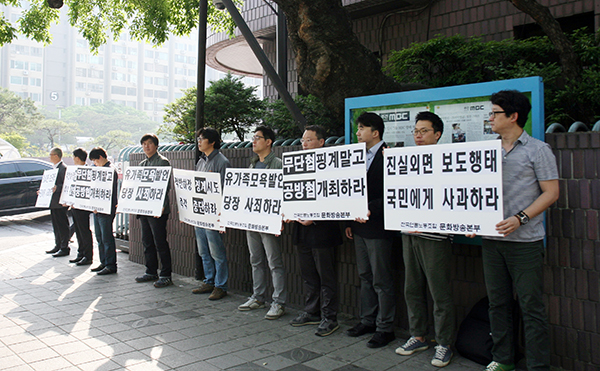 | ▲ 지난달 19일 전국언론노조 MBC본부가 여의도 사옥 앞에서 세월호 참사 보도에 대한 반성과 부당 징계 등에 항의하는 피켓팅을 벌이고 있다. (사진=MBC본부) | ||